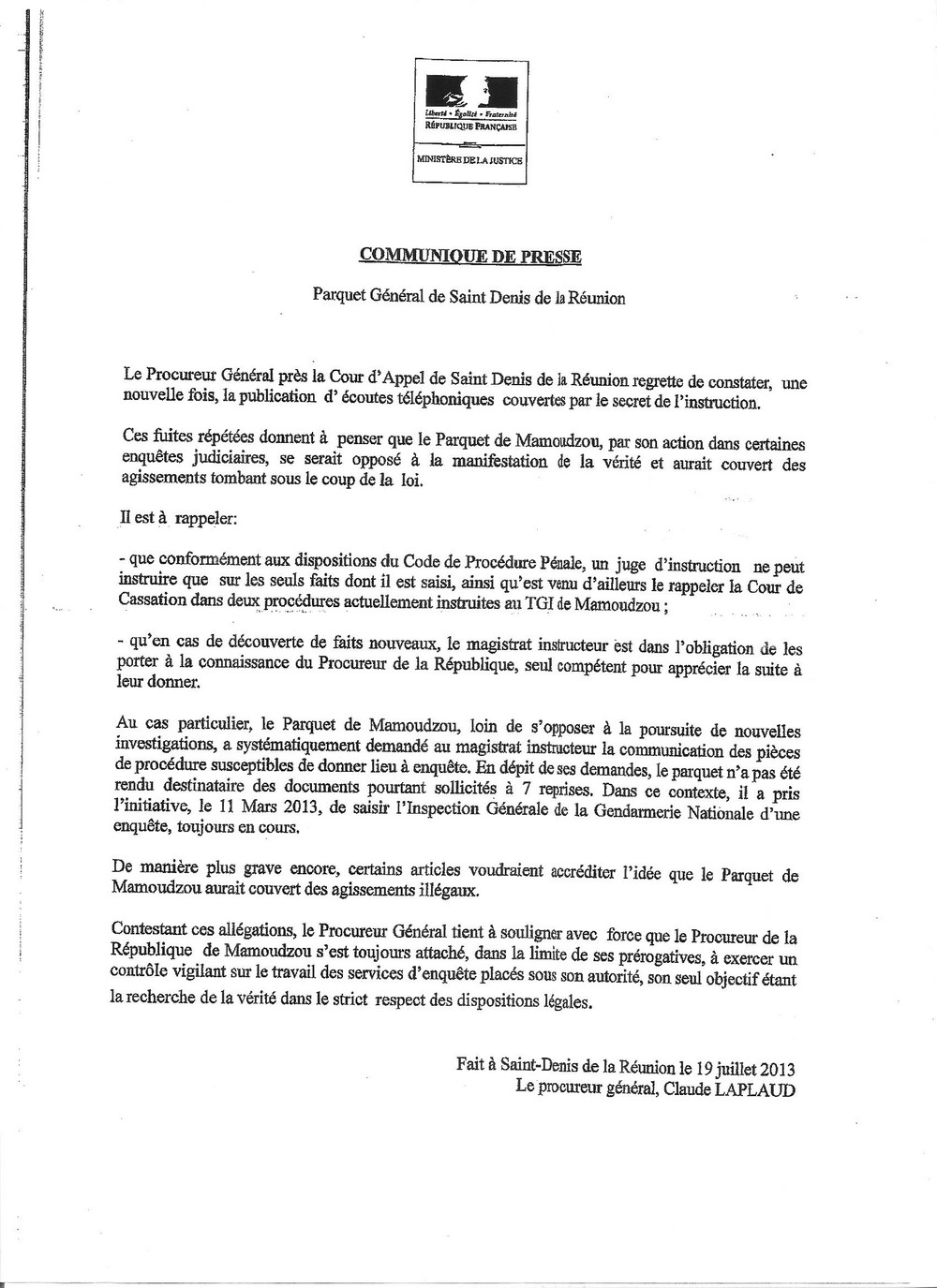 Quant aux divulgations de communications téléphoniques dans l’article du POINT N’ 2131 du 18 juillet 2013, elles constituent une violation du secret de l’instruction dénoncée le 19 juillet 2013 dans un communiqué de presse par le Procureur Général de la Cour de la RÉUNION. Ce haut magistrat rappelle par ailleurs qu’un juge d’instruction ne peut instruire que sur les seuls faits dont il est saisi …